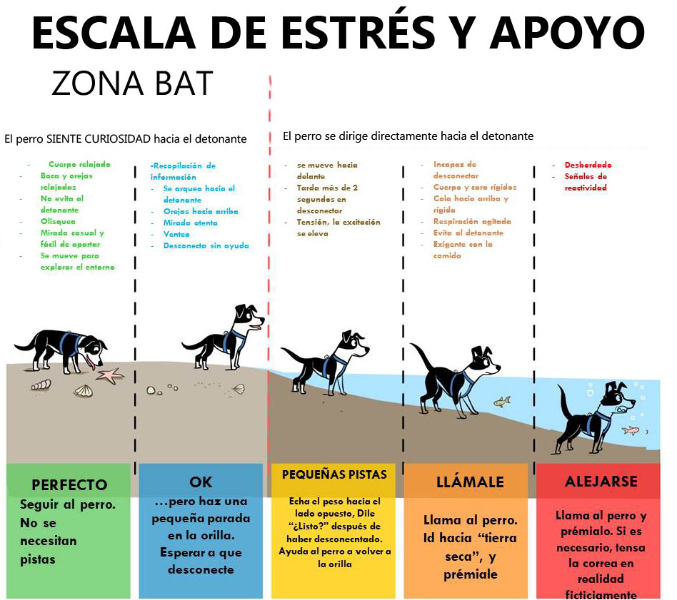 Cuando los adiestradores usan BAT dan a los animales control máximo de su experiencia dentro de un marco seguro, natural, como un socorrista que protege los nadadores en una playa. Los mejores socorristas mantienen las cosas divertidas y seguras permaneciendo sin intervenir, sin embargo, actúan rápidamente cuando es necesario. Un socorrista utiliza sólo el nivel de intervención para interrumpir las actividades inseguras. Con BAT, permitimos a nuestros animales explorar su entorno e intervenimos si – y sólo si – es necesario. Queremos mantener un escenario en el que nuestros alumnos se sientan seguros, por lo que miramos cuidadosamente la aparición de signos de estrés. Si el estrés se eleva más allá del nivel de interés curioso, animamos a nuestros estudiantes a evitarlo de la manera menos molesta que funcione para ellos.